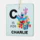 at christmass as a hanging decration for the chritmass tree.. its white porcline or cramic but very well made with added photo on one side.. also has a lovley red bag to keep it in.. execlent printed text in bold and black stands out well aganst the blue background of the photo.
