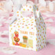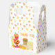 Send guests home with a smile using this festive fall-themed party favour box featuring Elmo in a playful jack-o'-lantern pumpkin costume. The front displays a cheerful “Thank You” message alongside autumn accents like hay bales, pumpkins, corn stalks, and a basket of vibrant fall flowers. The entire box is wrapped in a colourful pattern of scattered autumn leaves, creating a warm and charming touch for any fall first birthday party or Elmo-themed celebration.