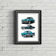 Infuse your space with nostalgia through this beautiful graphic showcasing three vintage cars in retro hues. Its striking yet classic design beautifully embodies the allure of classic automobiles and vintage styles, making it a must-have for any car enthusiast or lover of retro decor.