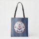 Adventure awaits with this nautical tote design featuring a ship's anchor with life preserver over a navy and white striped background.