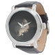 This men's watch features a setting moon on the face with black leather wrist strap and silver back.