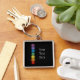 A graphic design of the seven chakras on a premium keychain. The keychain has a text template for your personalisation, and the background colour is changeable.
