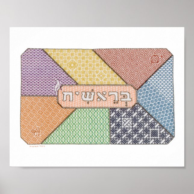 Surrounding the Hebrew letters "Bereishit"-- the Hebrew word for "In the beginning" or simply, the Hebrew name for the Book of Genesis -- are symbols of the seven days of Creation, with motifs that blend into the surrounding embroidery. From bottom right: Day 1: Light and Darkness; Day 2: Waters and Heaven; Day 3: Vegetation (the pomegranate); Day 4: Sun, Moon, and Stars; Day 5: Birds and Creeping things (here, a bird, whose crest is repeated into the pattern); Day 6: Animals and Humans (a squirrel); Day 7: The Sabbath, represented by a flowing, harmonious pattern. Embroidery pattern and font (c) 2017 Rachel Braun