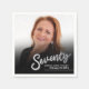 Seventy black and silver metallic affect script text photo napkins. Personalise this 70th birthday party script photo birthday napkin with your own birthday girls or boys name and photo plus and birthday date. Other years and matching items in silver or gold are also available. © Original design by Sarah Trett for www.mylittleeden.com on Zazzle.