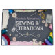 A vibrant and eye-catching shopping bag for sewing alterations services, perfect for tailors, seamstresses, and custom clothing creators. This professionally designed bag is great to deliver your finished clothing alterations in to your customer whether it may be for mending, tailoring, hemming, or custom sewing services. The front features a charming border of sewing tools—including buttons, spools of thread, pins and fabric swatches—set against a grey background for a cosy, yet professional feel. This promotional marketing material is ideal for using for your customer's clothes so they can remember where they got their clothes mended or altered.
