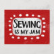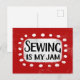 "Sewing Is My Jam" is a fun text design with a white accent shape surrounded by white whimsical textured dots.