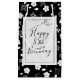Sewing needle with thread and black stitched frame on black and white floral print for 85th birthday.