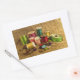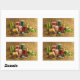 These colourful stickers idisplay the tools of the seamstress. Bright spools of thread in rainbow colours of green, red, pink, turquoise, yellow, gold, blue and orange stand beside a measuring tape, thimble, buttons and pins. All are set on an image of a brown burlap pattern background.