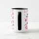 A mug featuring a sewing themed design consisting of a sewing machine, spools of thread, a pin cushion, scissors, fabric swatches, and sewing needles. Design has a pink colour scheme.