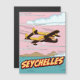 Seychelles cartoon style travel postcard art print of a prop aircraft flying to the islands.