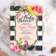 A Shabby Chic Baby Shower Floral watercolor Invitation in Pink and Yellow. Set on a navy striped background with floral bunches around the edges and a golden edged frame to hold your text.