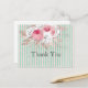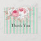 Pretty and feminine shabby chic thank you card features large bouquet of pink roses and other florals with rose gold leaves on background of distressed mint and pale pink stripes.