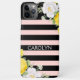 Contemporary pretty white and yellow roses floral design on a black and blush pink coloured stripes pattern. With room to customise or personalise with a name, monogram, or initials of your choice. Beautiful, elegant, and stylish cover for the trend-savvy and art-loving hip trendsetter, artsy motif lover who wants to protect their phone from dust and dirt, wear and tear. This design is available in Apple iPhone 6, 7, and 8 Plus, 10 or X, XR, XS, 11, 12, 13 Mini, 14, 15 Plus, and Pro Max cellphone cases. Show off your style, look fashionable, and feel stylish with a unique design on a mobile device accessory of your choice.
