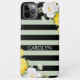 Contemporary pretty white and yellow roses floral design on a black and light sage green coloured stripes pattern. With room to customise or personalise with a name, monogram, or initials of your choice. Beautiful, elegant, and stylish cover for the trend-savvy and art-loving hip trendsetter, artsy motif lover who wants to protect their phone from dust and dirt, wear and tear. This design is available in Apple iPhone 6, 7, and 8 Plus, 10 or X, XR, XS, 11, 12, 13 Mini, 14, 15 Plus, and Pro Max cellphone cases. Show off your style, look fashionable, and feel stylish with a unique design on a mobile device accessory of your choice.