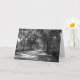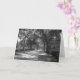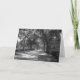 A black & white study features a peaceful Savannah road shaded by moss-covered oaks.