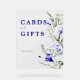 The shade of royal blue ivory floral wedding “Cards and Gifts” acrylic sign features a translucent background with elegant floral illustrations in blue and ivory hues, complemented by greenery. This sign is perfect for wedding receptions, providing a stylish and functional way to designate where guests can leave their cards and gifts.