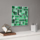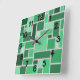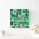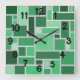 This wall clock has a Bauhaus design of rectangles formed with gray lines filled with different shades of green.