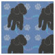 This fun, cute black shadow silhouette style Poodle stands with a smile ,against a blue background with paw prints and tracks in grey, blue and pink.. Design by Diane Blackman. The same design is available with other fun dog images.