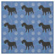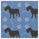 A black shadow silhouette style Schnauzer on a background of blue with paw prints and tracks of grey, blue and pink.