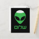 Green alien head with big eyes wearing a kippah/ yarmulke with "Shalom" in Hebrew below.