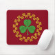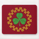 According to tradition, Saint Patrick used the three-leaf clover to illustrate the Christian Trinity. Although the authenticity of this tradition is in question, the shamrock has become a symbol of Ireland. This design combines the green shamrock with a circle of Celtic-style knotwork in yellow, both on a red background.