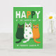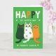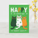 On the front of the card a trio of cartoon cats cuddle side by side on a rich emerald green background, giving each other soft, friendly looks that feel a little romantic and a lot affectionate 💚. At the top, the large headline “HAPPY ST. CATTY’S DAY” stretches across the upper area in mixed white, orange, and deep forest green letters. Below it, a dark green cat with golden eyes leans into a white cat sprinkled with small shamrocks, while a warm orange cat presses close on the other side ☘️. Their rounded faces and simple smiles make the group look like they’re sharing one cozy hug. Small shamrock shapes are scattered around them, echoing the holiday theme without crowding the scene. Near the bottom, the words “FAVORITE COUSIN” appear in a clear, light-colored font that stands out against the green. A faint shadow beneath the cats and lettering adds a slight sense of depth, and the shamrock speckles on the white cat are spaced evenly across its body.