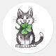 A black and white cat holding a three-leafed shamrock in his mouth, for St. Patrick's Day, or just for fun!