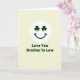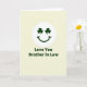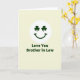 Designed with a muted lime-green background, this St. Patrick’s Day card centers a white circle like a spotlight on a friendly smiling face. Two dark green shamrocks sit as the eyes, angled evenly to give the face an affectionate, “thinking of you” look ☘️. A smooth dark green arc forms the smile, simple and steady, like a quiet grin shared between close family. Beneath the face, the message “Love You Brother in Law” is placed in a clear sans-serif font and colored the same deep green for a unified look 💚. The text sits centered under the circle, with comfortable spacing that keeps the design easy to read. The limited palette—soft green, white, and deep green—keeps everything focused on the shamrock eyes and the message. The shamrocks are filled in solid dark green, standing out crisply against the white circle. Share St. Patrick’s Day sentiments with someone who feels like a true friend in the family.