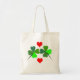 Two digitally created shamrocks in various shades of green facing each other over two red hearts.