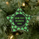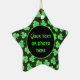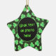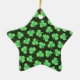 Star-shaped ceramic ornament with an image, on both sides, of rough-edged green shamrocks, green polka dots, and gold speckles on black. The front has a black circle with a green border for your text or photo. See the entire St. Patrick's Day Ornament collection in the SPECIAL TOUCHES | Party Favors section.