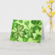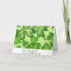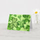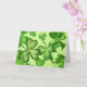 Graphic illustration of shamrocks in different shapes and sizes on a pale green background.