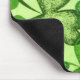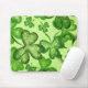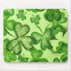 Graphic illustration of shamrocks in different shapes and sizes on a pale green background.