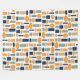 This large fleece blanket has a mid-century modern design of ovals and rectangles in patterns repeating in the design.