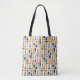 This tote bag has a mid-century modern design of ovals and rectangles in patterns repeating in the design.