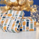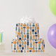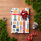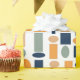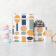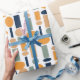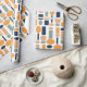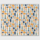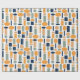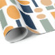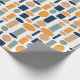 This wrapping paper has a mid-century modern design of ovals and rectangles in patterns repeating in the design.