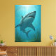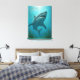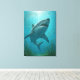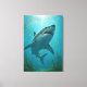 A striking underwater artwork featuring a powerful shark viewed from below, surrounded by a lively group of small fish. The scene includes soft drifting seaweed and gentle sunlight rays filtering through the water, creating a dynamic and immersive ocean atmosphere.