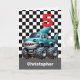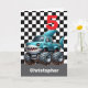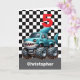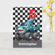 A personalised shark monster truck 5th birthday card for boys. Featuring a black and white chequered background on the front with a place you can easily personalise the age if needed. A blue shark monster truck will delight all shark and monster truck fans. A fin-tastic choice of a personalised boy's birthday card for your son, nephew, grandson, etc.