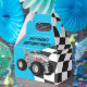 I hope you'll enjoy this racing chequered flag on a bright blue background with a shark monster truck.