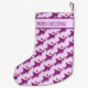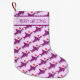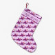 A fun animal Christmas stocking with a cartoon pattern of smiling, purple, sharks wearing Santa hats and the customisable words ‘Merry Christmas’ on a light purple background. The stocking is double-sided. Make your Christmas sharktacular with this personalised holiday stocking. The words “Merry Christmas” are customisable to your favourite phrase or a special name.