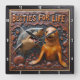 This dramatic square wall clock features a highly dimensional, close-up illustration of a gray shark with sharp teeth and a large, smiling orange-brown seal swimming together. The entire design is rendered in muted brown, gray, and dark blue tones, suggesting a deep carved relief or Engraved Wood Look, resembling aquatic rock formations. The shark is partially concealed behind the seal and features detailed gills. The seal appears cheerful, positioned in the right foreground. The background is a dark, textured field filled with stylized coral and bubbly rock shapes. The large, three-dimensional embossed text "BESTIES FOR LIFE" is carved across the top center. The clock face features a simple clock face border with large, white, numbered tick marks (1 to 12) integrated into the outer frame. The artwork is surrounded by a thick, dark brown decorative border that resembles a black wood frame.