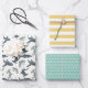 Wrap your gifts with coastal charm using this Shark-Themed Wrapping Paper Set from the Beach Club Sharks Collection! This three-piece set includes three unique designs inspired by the ocean: a bold watercolor shark pattern featuring great white and hammerhead sharks, a chic aqua and white wave pattern, and a classic yellow and white cabana stripe design. Each sheet measures 19 x 29 inches — the perfect size for wrapping small gifts, party favours, and more. Available in your choice of matte or satin finish for a polished, professional look.