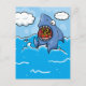 Featuring an awesome cartoon Great White Shark with a red and yellow birthday present balanced on his tongue in a choppy blue sea.