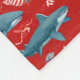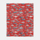 Blanket in a pattern of swimming sharks, fish and aquatic plants on a deep red background