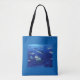 Tote bag is shown in a pretty colour of royal blue with a photo print of sharks in the deep sea, customise this tote and add more or buy as is.