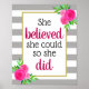 This cute, colourful vintage modern motivational design features the inspirational words, "She believed she could so she did" in popular typography in black and hot pink inside of an elegant gold-edged white area with bouquets of bright pink flowers on the corners. Behind the design is a background of grey and white stripes. This lovely design beautifies your room or office and provides daily encouragement.