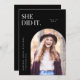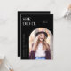 Modern graduation announcement card featuring a black arch frame for your photo. The text says "SHE DID IT."