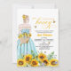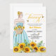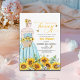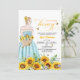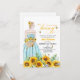 An elegant Bridal Shower design with a bride to be on a sunflower field and elegant calligraphy.