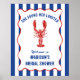 Welcome guests to your nautical themed bridal shower with this personalized welcome sign poster. It features my hand-drawn realistic style illustration of a lobster in red with your custom text in blue lettering. The "She Found Her Lobster" slogan is fun for bridal showers, but can easily be customized with your own message. The text and graphic are set inside of a wavy scalloped red frame against a background of blue and white nautical stripes.