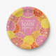 Whimsical citrus fruit in pinks, coral, orange and ruby red grapefruit colours. The hand drawn citrus slices include a watercolor painted texture for a juicy addition to a colourful wedding shower paper plate.