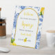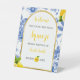 The welcome pedestal sign for the She Found Her Main Squeeze bridal shower features blue flowers, yellow lemons, and black-and-yellow text.